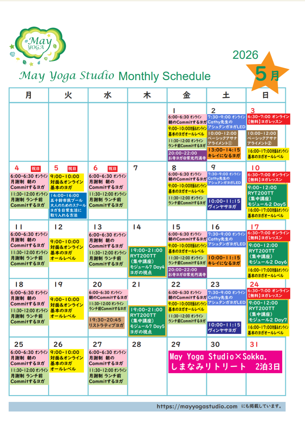 20 06:00 06:30 朝Commit May 11:30 12:00 ランチ前Commit May | 21 09:00 10:00 基本のヨガ May | 22 06:00 06:30 朝Commit May 11:30 12:00 ランチ前Commit May 19:30 20:45 リストラティブヨガ May | 23 | 24 06:00 06:30 朝Commit May 09:00 10:00 基本のヨガ May 11:30 12:00 ランチ前Commit May | 25 07:30 09:00 アシュタンガLED Cathy先生 10:00 12:00 Tylerヨガ数秘学 Tyler先生 13:00 14:15 ヴィンヤサヨガ May | 26 06:30 07:00 無料オンライン May 09:00 12:00 RYT②-4 理解する May & Yuki先生 16:00 17:00 基本のヨガ May |