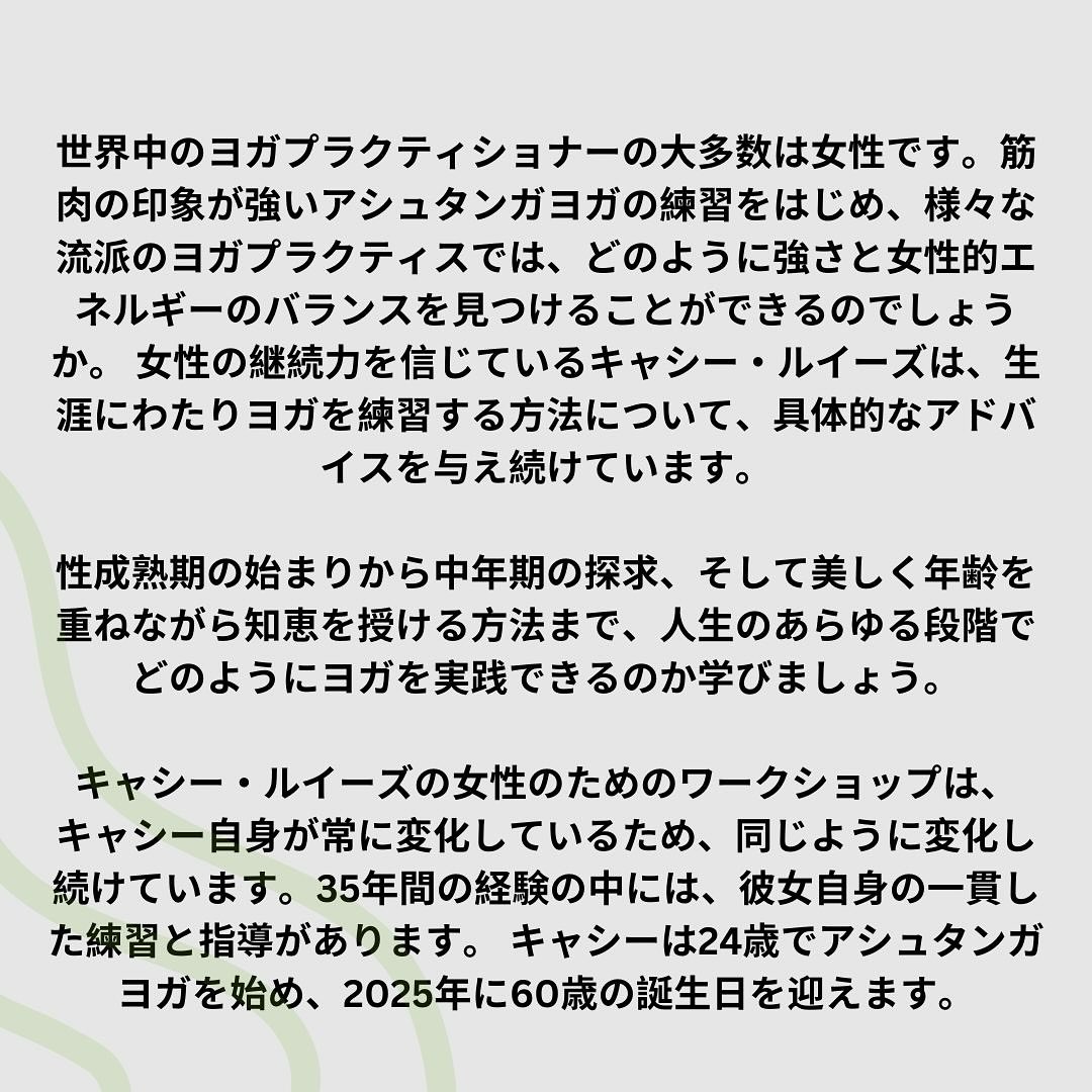そんな強いヨガプラクティスを女性が生涯練習し続けるための方法を、思春期、中年期、更年期、閉経期を経た自らの経験から、世界に伝え続けてくれている先生をMay Yoga Studioにお招きします。