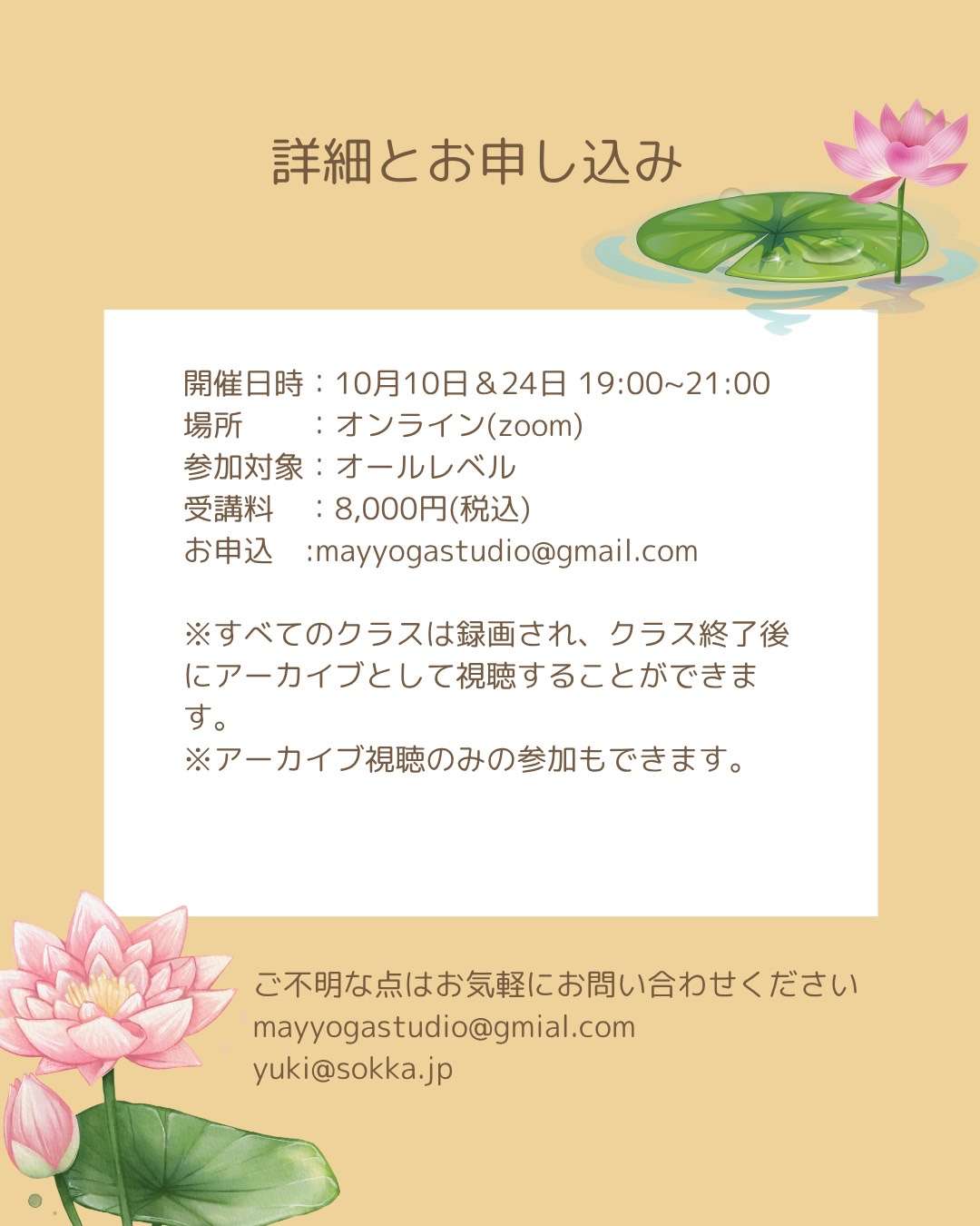 お申し込みは、May Yoga Studioのメールに、①お名前 ②メールアドレス ③講師への質問等あれば をお書きの上、お送りください。